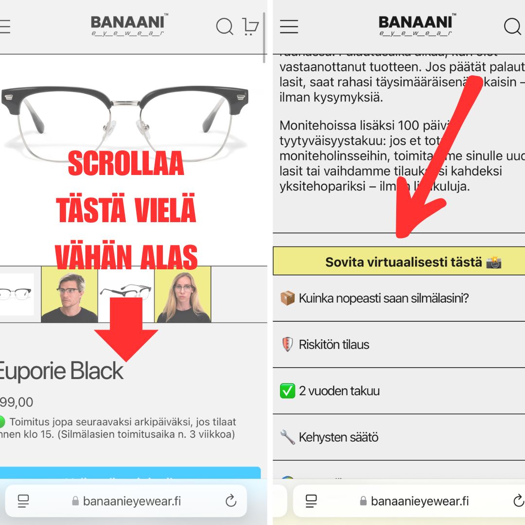 Kaikissa Banaanin kehyksissä on virtuaalisovitus, jonka avulla voit kokeilla laseja suoraan kasvoillesi kameran avulla.